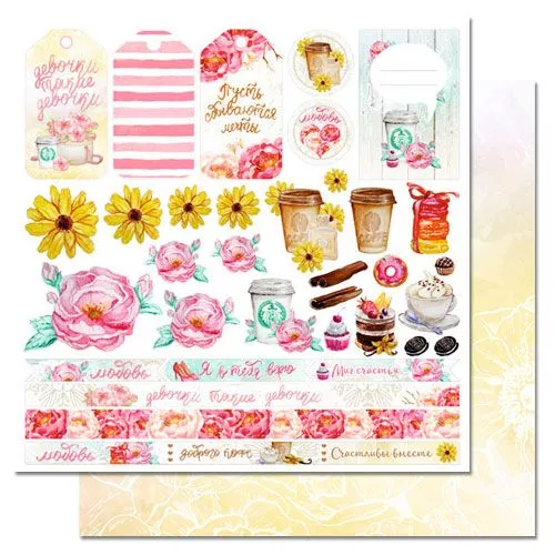 Создавайте уникальные истории с Бумага "Любовь начинается с кофе. Картинки" (ScrapMania). Яркие цвета, интересные узоры и различные текстуры — все, что нужно для ваших творческих экспериментов.