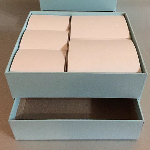 Чудесная конструкция для создания маминой сокровищницы или хранения ценных мелочей. Состоит из основы (размер 16х18х10 см), выдвижного ящика (размер 17,2х15,4х4,7 см), 3 маленьких коробочек с откидной крышкой (размер 4,8х7х3,8 см) и 2 больших (размер 7,2х9,4х3,8 см). Основа и выдвижной ящик выполнены из толстого переплетного картона, коробочки из плотной бумаги. Для такой заготовки можно создать, проявляя фантазию, свою особенную крышечку, которая подходит именно Вам