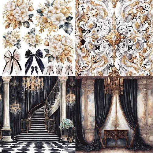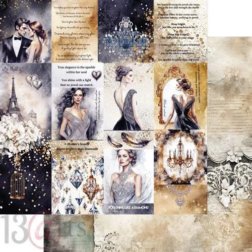 В наборе 6 двусторонних листов разного дизайна и 3 двусторонних листа с элементами для вырезания. На обратной стороне обложки расположены 4 сюжетные карточки. Плотность 250 гр/м2. Торжественная вечерняя коллекция с благородными принтами и богатой цветовой палитрой