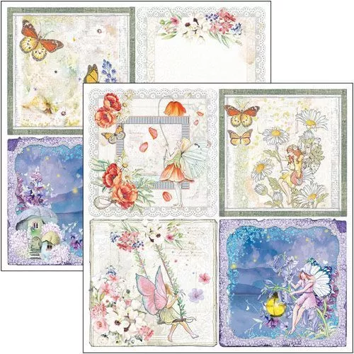 В наборе 8 двусторонних листов разного дизайна. Плотность 190 гр/м2. Дополнительный бонус - карточки и фоновый фрагмент на обратной стороне обложки. Прекрасное дополнение к основной коллекции. Сказочная коллекция про маленьких цветочных фей