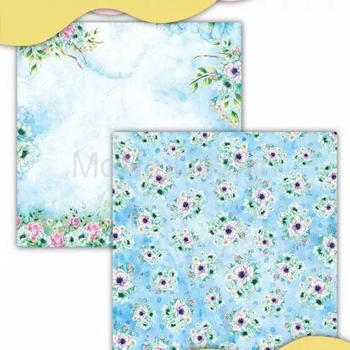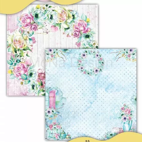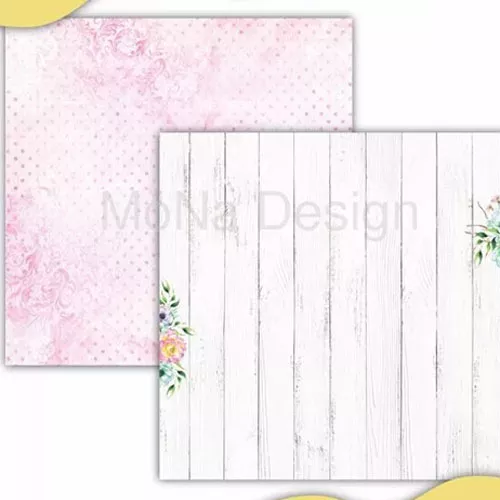 В наборе 10 односторонних листов разного дизайна, 1 односторонний лист с карточками и 1 односторонний лист с картинками для вырезания. Плотность 190 гр/м2. Малиново-мятная коллекция с прекрасными фоновыми дизайнами и акцентными деталями