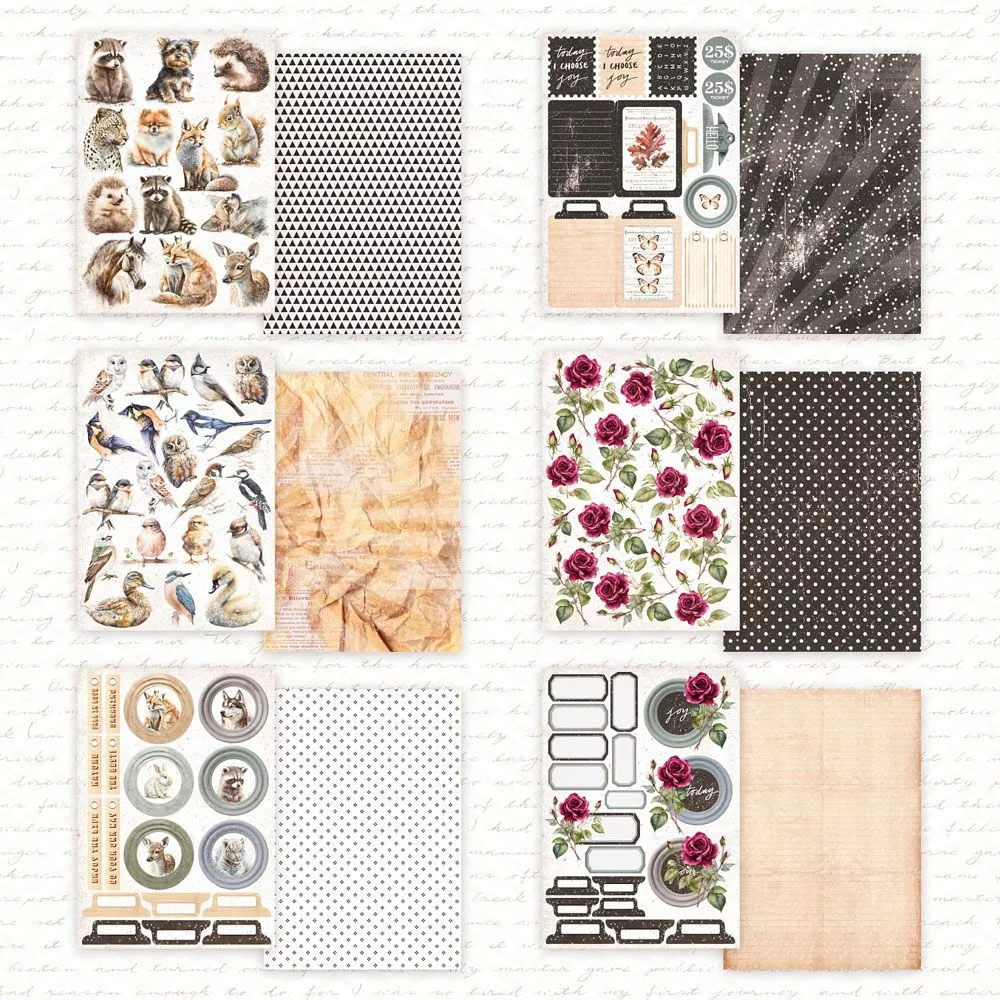 В наборе 18 двусторонних листов с картинками для вырезания (каждого дизайна по 3 листа). Плотность 190 гр/м2. Ненавязчивая коллекция для создания работ в стиле Эко
