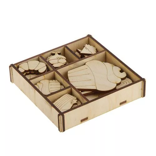 В наборе 30 украшений, размер от 2х3,5 см до 7х7,5 см, толщина 0,4 см. Украшения упакованы в деревянную коробочку. Ее размер 13х13 см, высота 2,7 см - можно использовать как мини шадоубокс
