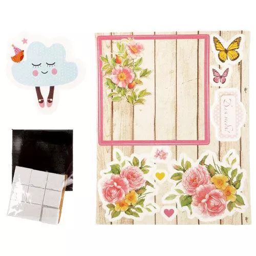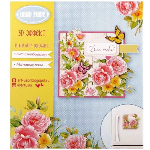 В набор входит лист из плотной бумаги с высечками, картонная вырубка для украшения, магнитный листик, объемные клеевые подушечки. Создание такого объемного магнита порадует детей и взрослых, размер около 7х7 см