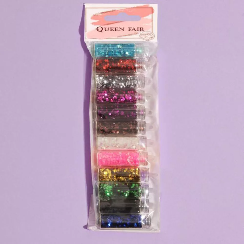 В наборе 12 баночек с крупным глиттером. Можно использовать как наполнитель для шейкера или в качестве подвески на корешок блокнота. Каждый бутылек имеет плотную крышку с отверстием. Внимание! Соотношение цветов в упаковке может не совпадать с указанными на фото