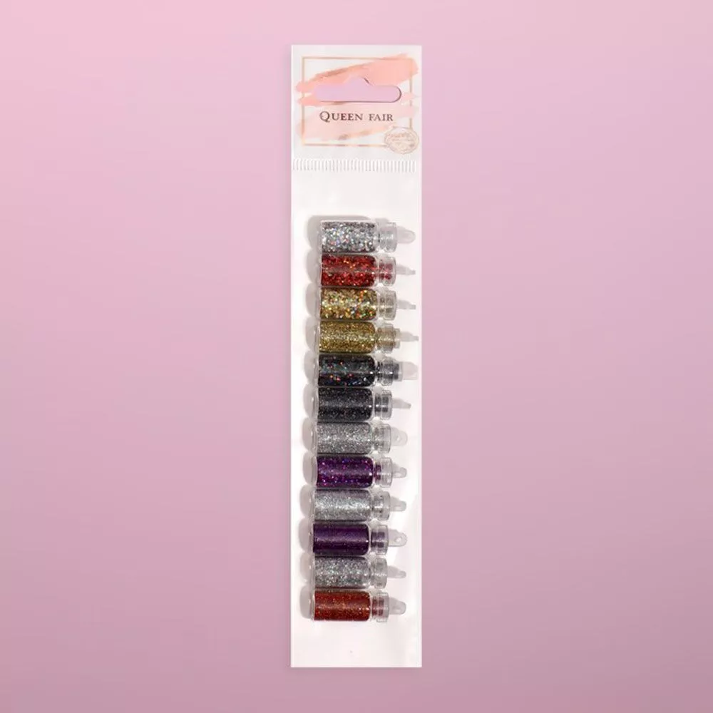 В наборе 12 баночек с глиттером. Можно использовать как наполнитель для шейкера или в качестве подвески на корешок блокнота. Каждый бутылек имеет плотную крышку с отверстием. Внимание! Соотношение цветов в упаковке может не совпадать с указанными на фото