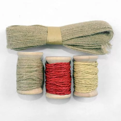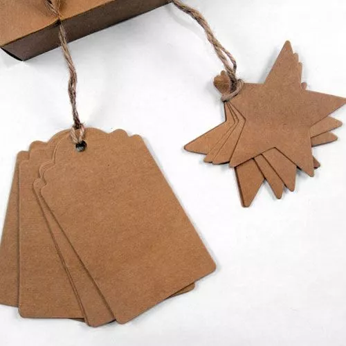 Большой новогодний набор для украшения подарков. 6 фигурных крафт-ярлычков (размер 6х10 см) и 6 в форме звезд (размер 7х7см), 2 катушки с рафиевыми лентами, 1 катушка с джутовым шапагатом и 1 моток с джутовыми шнурочками, скреплены леской