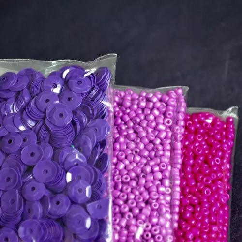 В наборе 1 пакетик с гранеными пайетками (диаметр 0,7 см) и 2 пакетика с бисером (диаметр 0,2 см)