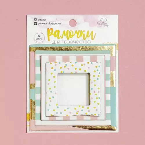 В наборе 4 рамочки разного размера из плотного картона, одна из них украшена красивым золотым фольгированием. Размер маленькой рамки 5х5 см (с окошком 3х3 см), большой - 8х8 см (с окошком 6х6 см)
