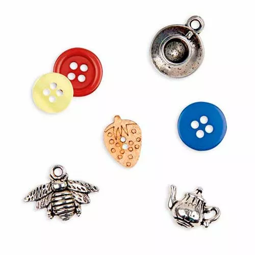 Описание В наборе 32 украшения (металлические фигурки и подвески, пластиковые и деревянные пуговки), средний размер 1,1х1,5 см