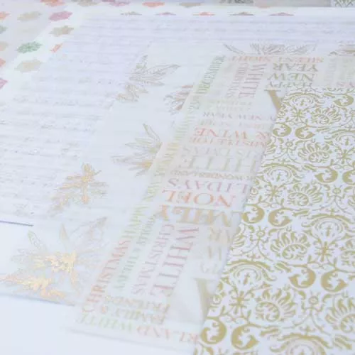 В наборе 8 листов веллума (кальки), некоторые фольгированы и 2 листа перламутровой бумаги. Каждого дизайна по 2 листа. Плотность 135 гр/м