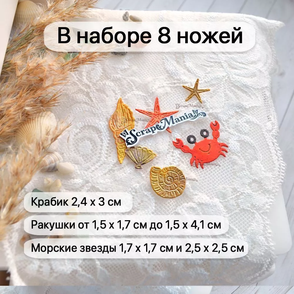 В наборе 8 ножей, соединенных перемычкой, которую при необходимости можно перекусить. Общий размер ножа 5х6,5 см. Размеры: крабик 2,4х3 см и глазки 0,5 см, ракушки 1,5х1,7 см, 1,9х1,9 см и 1,5х4,1 см, морские звезды 1,7х1,7 см и 2,5х2,5 см. Прекрасно подойдет для создания декора к самым разным тематикам, а особенно к летним страничкам и альбомам об отпуске. А также идеально дополнят работы в деревенском стиле. Отлично сочетается с другими ножами из серий "Пляж" (арт. 255665, 255666 и др), "Море" (арт. 255674, 255674 и др) и с нашими коллекциями бумаги "Море, я скучала", "Мой капитан", "Океания" и "Морячок"