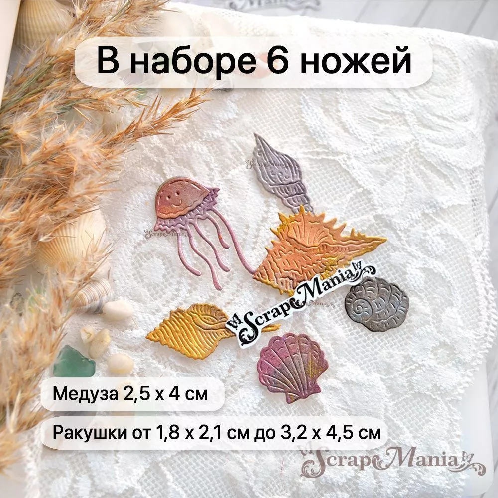 В наборе 6 ножей, соединенных перемычкой, которую при необходимости можно перекусить. Общий размер ножа 5,7х7,4 см. Размеры: туловище медузы 2,5х4 см, личико медузы 1,3х1,8 см, ракушки 1,8х2,1 см, 2,1х2,1 см, 1,7х4,1 см и 3,2х4,5 см. Прекрасно подойдет для создания декора к самым разным тематикам, а особенно к летним страничкам и альбомам об отпуске. А также идеально дополнят работы в деревенском стиле. Отлично сочетается с другими ножами из серий "Пляж" (арт. 255664, 255668 и др), "Море" (арт. 255673, 255676 и др) и с нашими коллекциями бумаги "Море, я скучала", "Мой капитан", "Океания" и "Морячок"
