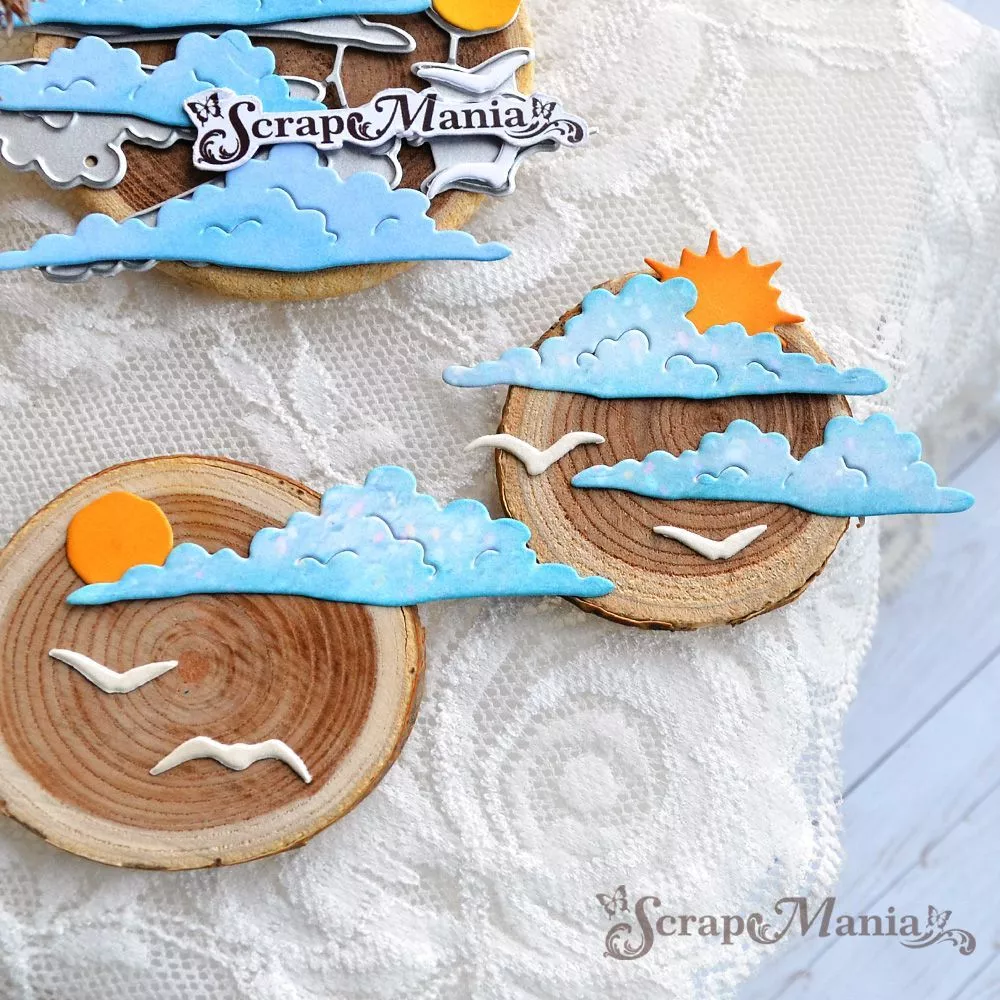 В наборе 6 ножей, соединенных перемычкой, которую при необходимости можно перекусить. Общий размер ножа 6,5х6,8 см. Размер облаков 1,3х4,9 см, 1,5х5,4 см и 1,7х6,3 см, солнышка с лучами - 2х2,2 см, солнышка круглого - 1,1 см, размер ножа с тремя чайками - 2х2 см. Вырубку можно использовать в задумках про летние путешествия и море, про отпуск, а также в детских работах