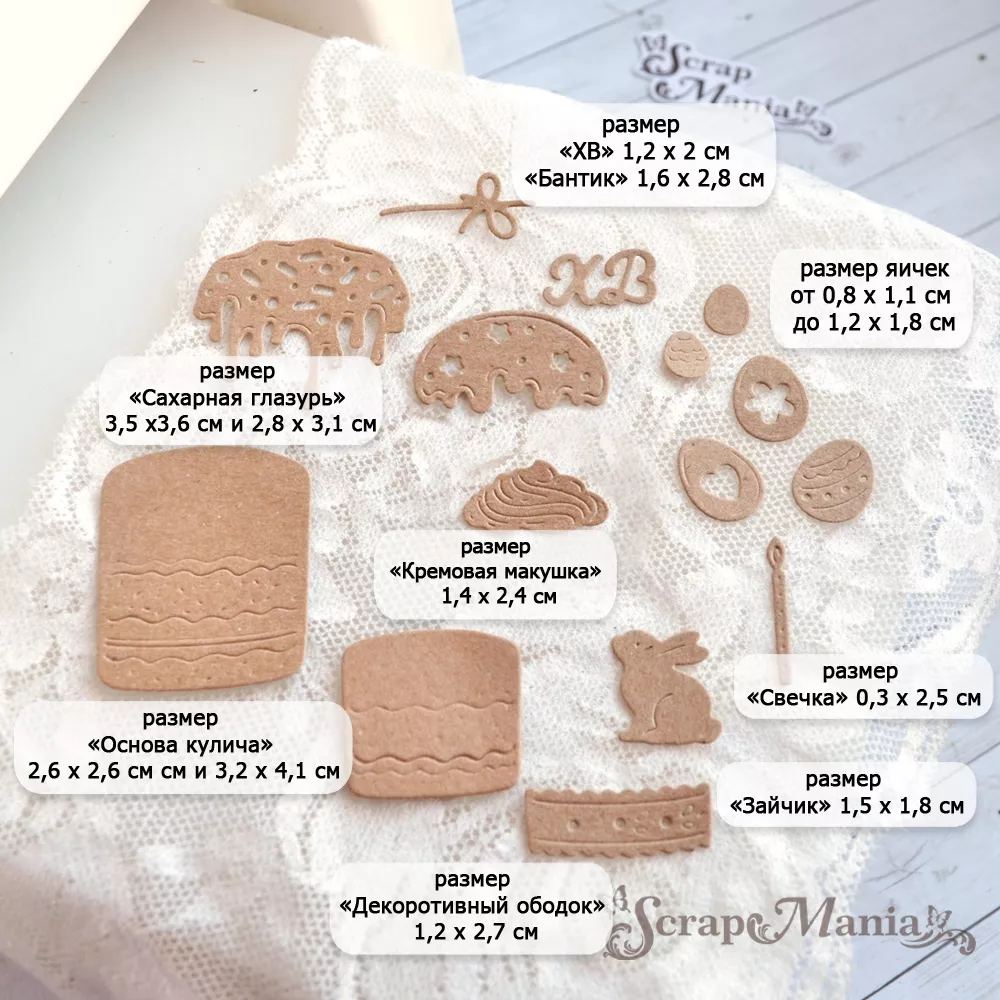 В наборе 16 ножей, соединенных перемычкой, которую при необходимости можно перекусить. Общий размер ножа 9,1х10,5 см. Размер основ кулича 3,2х4,1 см и 2,6х2,6 см, сахарной глазури - 2,8х3,1 см и 3,5х3,6 см, яичек - от 0,8х1,1 см до 1,2х1,8 см, свечки - 0,3х2,5 см, зайчика - 1,5х1,8 см, листика 1х1,2 см, слов "ХВ" - 1,2х2 см, кремовая макушка -1,4х2,4 см, декоративный ободок - 1,2х2,7 см, бантик - 1,6х2,8 см. Нож отлично подойдет для создания пасхального декора, открыток и весеннего настроения. Нож-конструктор сочетается со всеми ножами из серии "Пасха" (арт. 246827, 246823, 246824, 246829, 246830, 246832 и др)
