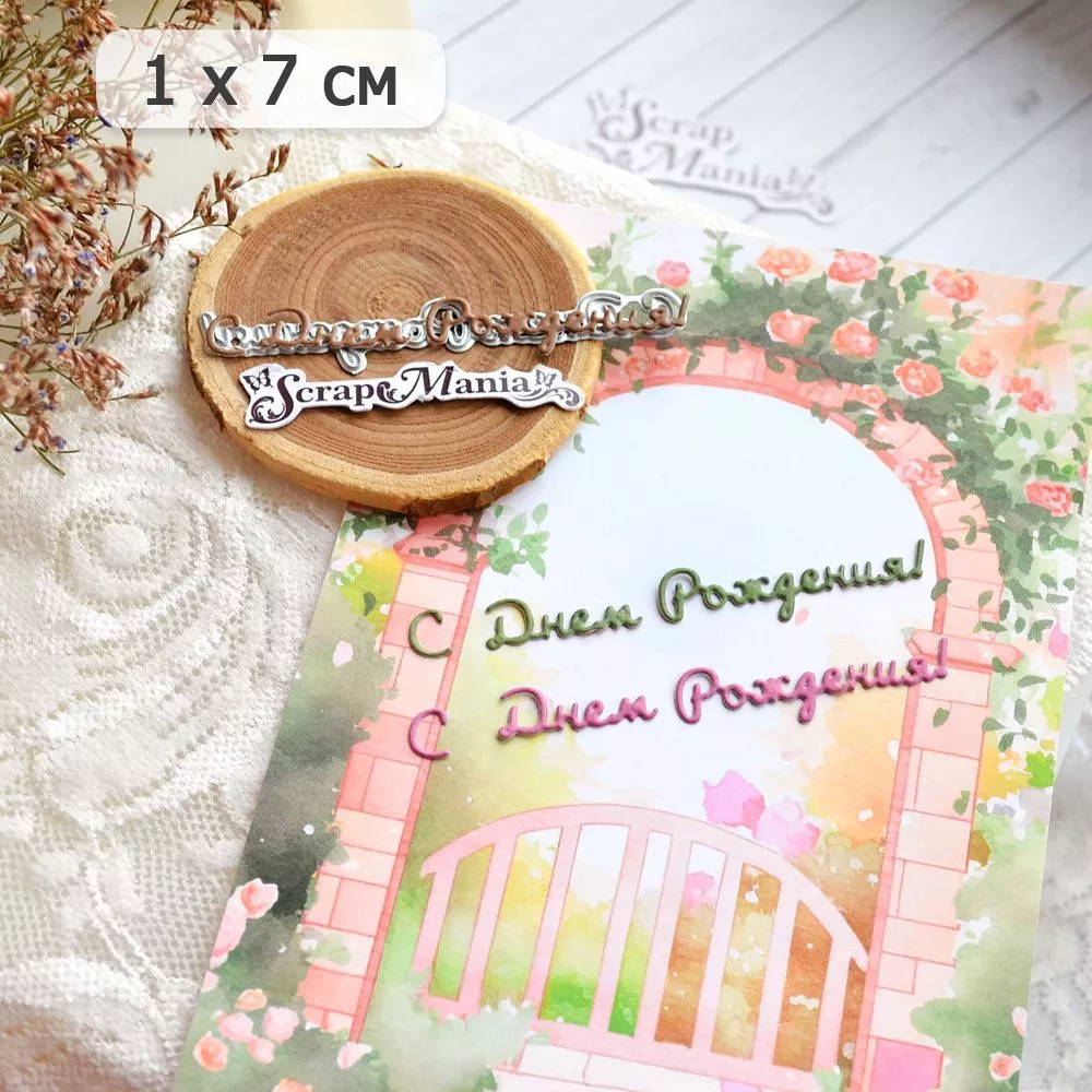 Размер ножа 1х7 см. Нож вырубает 3 слова. Размер вырубки "С" - 0,5х0,8 см, размер вырубки "Днем" - 0,7х2,2 см, размер вырубки "Рождения!" - 1х3,9, см. Вырубка прекрасно дополнит любые поздравительные открытки. Творите волшебство своими руками