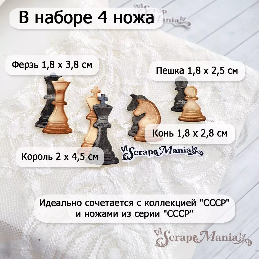 В наборе 4 ножа, соединенных перемычкой, которую при необходимости можно перекусить. Общий размер 4,8х5,9 см. Размер фигур: "Король" - 2х4,5 см, "Ферзь" - 1,8х3,8 см, "Конь" - 1,8х2,8 см, "Пешка" - 1,8х2,5 см. Нож отлично подойдет для создания ретро альбомов, открыток и страничек. Идеально сочетается с коллекцией "СССР" и ножами из серии "СССР" (арт. 255342, 255343 и 255344), хорошо дополнит композицию, собранную из вырубки этой серии
