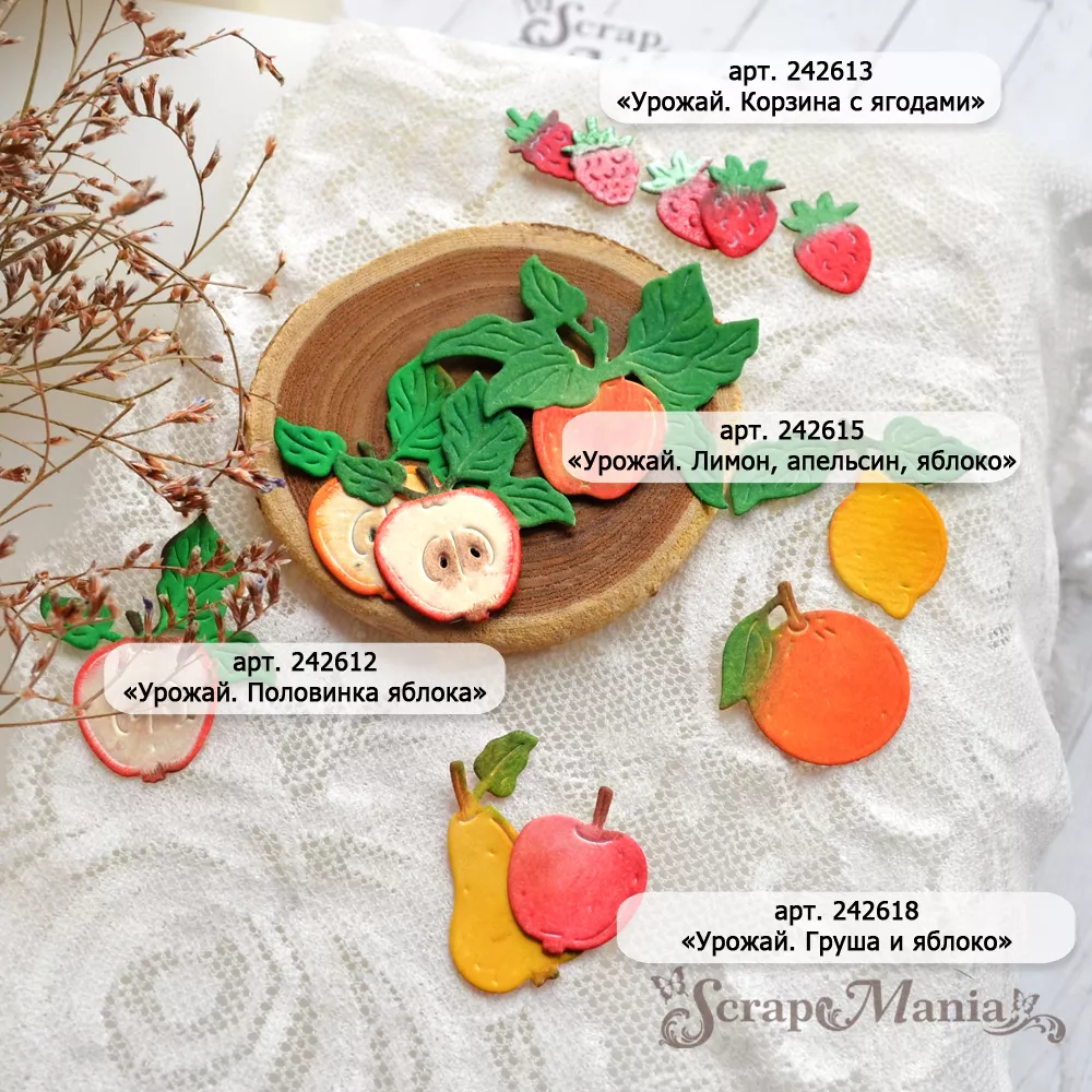 В наборе 5 ножей, соединенных перемычкой, которые при необходимости можно перекусить. Общий размер ножа 6х7,1 см. Размер яблока с листьями 3,7х4,5 см, лимона с листьями 2,8х3,2 см, апельсина с листиком 2,4х2,4 см, листьев 1,2х2,1 см и 0,8х1,5 см. Отлично сочетаются с ножами из серии "Урожай" (арт. 242618, 242617, 242612 и 242613) и с серией "Чаепитие" (арт. 242611, 242614, 242616, 241480 и 241482). Прекрасное дополнение к летним и осенним работам. Идеально подойдут для создания кулинарных блокнотов, альбомчиков про сад-огород и страничек про уютные семейные встречи