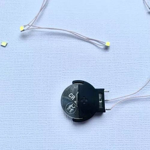 Подсветка с 5 светодиодами желтого цвета (расстояние между диодами 5 см). Модуль состоит из тонких проводков (общая длина устройства в расправленном виде около 29 см), кнопки переключателя (размер 4,5х9 мм), бокса для заменяемой батарейки (диаметр 2,3 см, толщина 6 мм) и батарейки CR2032 (входит в комплект). Переключатель работает по принципу "нажал-вкл, нажал-выкл". Идеально подходит для имитации огня в камине или пламени свечи, для панно, холстов и ночников, для открыток, АТС, скраплингов, шоколадниц, обложек альбомов и блокнотов. Яркий и впечатляющий, но при этом компактный светодиод - прекрасное дополнение для создания новых эффектов