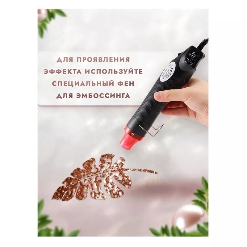 При запекании пудра создает непрозрачное объемное покрытие с эффектом металлического литья. Способ применения: нанесите клей для эмбоссинга на штамп или нарисуйте кистью на поверхности задуманный рисунок, затем нанесите пудру для эмбоссинга, пудра останется только там, где был нанесен клей, излишки пудры стряхните обратно в баночку. После этого, нагрейте полученный оттиск феном для горячего эмбоссинга, пока пудра полностью не расплавится