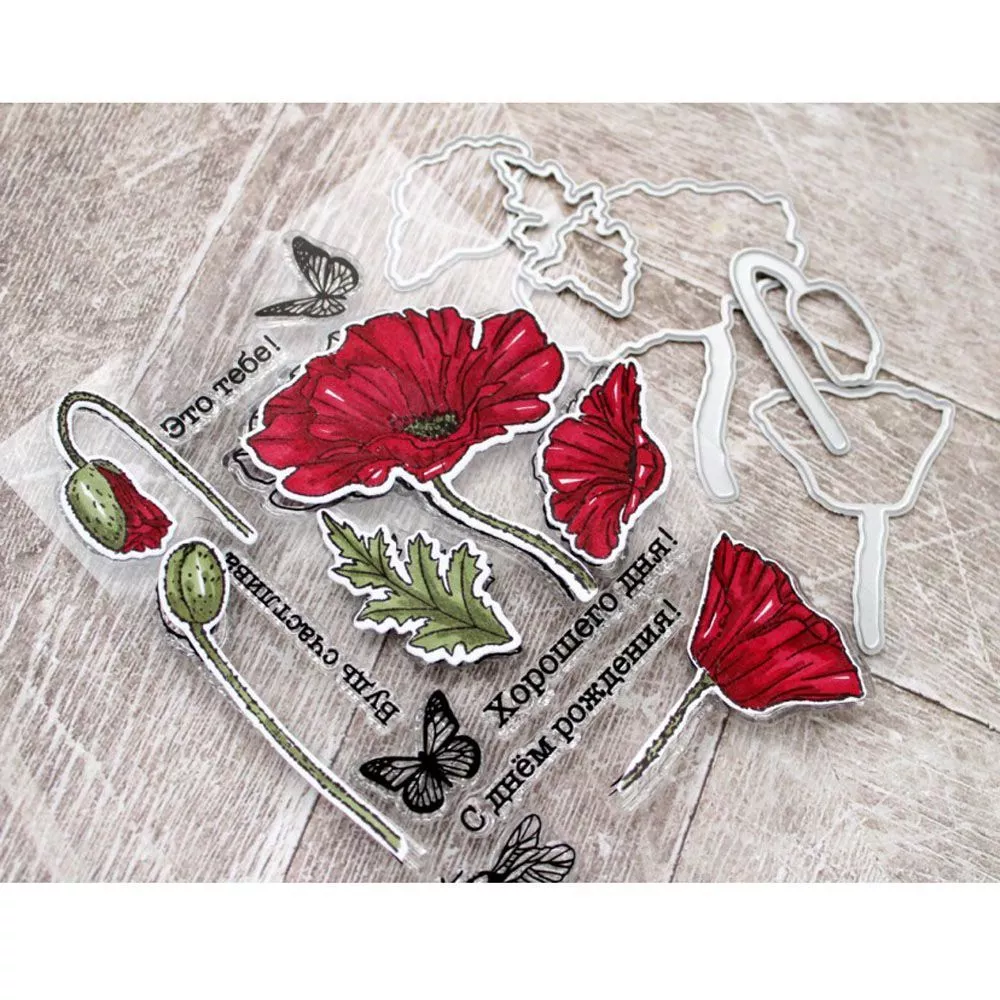 В наборе 13 штампов. Размер большого мака 5,4х6 см, лист 1,9х3,6 см, надписи 4,7х0,3 см, 4,2х0,3 см, 3,7х0,3 см, 2,3х0,3 см